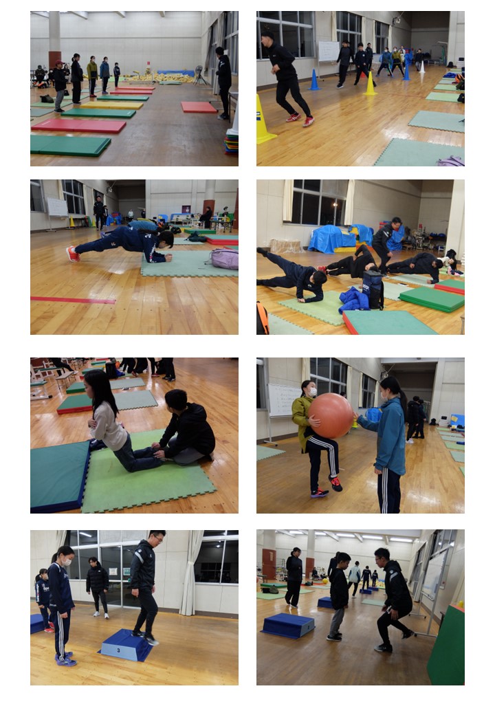 講師の渡辺幸太郎により、正しいウォーミングアップ、ストレッチ、スポーツ活動の中で繰り返し行われる動作の正しいフォームなど、幅広い運動に関する指導が行われた。ウォーミングアップの指導に関しては、実際に参加者の子どもたちが普段行っている運動についてヒアリングした後、国際サッカー連盟が提唱している「11+」という専門的かつ実践的なウォーミングアッププログラムを参加者全員で実施した。この運動プログラムは、インターネット上で実施方法に関する表面的な情報を得ることができるものの、渡辺氏がこれまで経験してきた事例などを元に特に留意するべき点などについて細かく指導が行われながら、実施された。また、スポーツ活動の中で繰り返し行われる動作については、着地動作や方向転換動作などで見られる片脚での着地動作に着目し、このシーンで生じやすい膝前十字靭帯損傷が生じやすいフォームの説明と、これを予防するためのエクササイズ、トレーニングなどを全員で実際に実施した。特に怪我につながりやすい悪いフォームについては、テキストなどで情報を得ることができるものの、実際に専門家に見てもらわなければ適切なフォームであるか判断するのが困難である。今回の公開講座では、渡辺氏による指導が丁寧に行われ、参加者の中でも今後注意して学んだトレーニングを継続して行く必要がある子どもたちが数人見られた。
