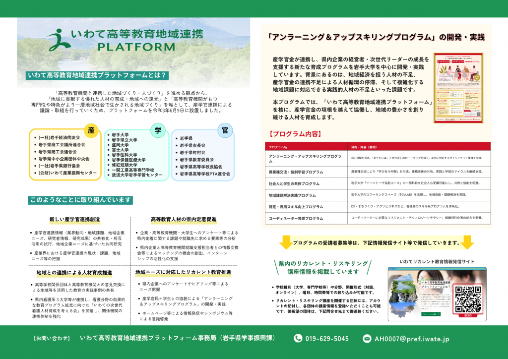 岩手大学では、岩手県内の産学官21団体で構成される「いわて高等教育地域連携プラットフォーム」と連携し、県内企業・自治体の経営者層および次世代リーダー層を対象とした「岩手産学官協創リーダーシップ講座(仮称)」の開設準備を進めています。